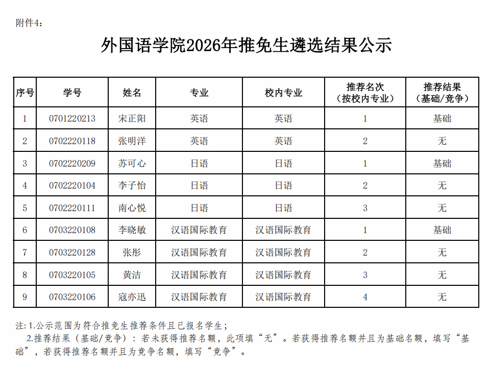外国语学院2026年推荐优秀应届本科毕业生免试攻读研究生遴选结果公示
