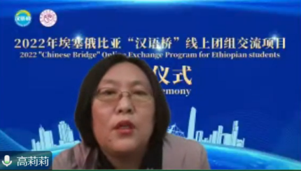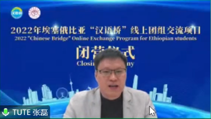 国际交流处处长张磊表示这是一次成功的线上交流项目,他向结业的学员们表示祝贺,也向各位老师表示感谢。他认为“汉语桥”是学员接触中国文化的语言之桥,是学员实现职业素养提升的能力之桥,是多方共同实施的教育之桥,更是中华文明和非洲文明互通互鉴的文明之桥。天津职业技术师范大学将携手两所孔子学院,为埃塞俄比亚培养更多高水平的技能人才,服务“一带一路”建设,推动构建人类命运共同体。最后,他热情地欢迎广大学员们来华留学。