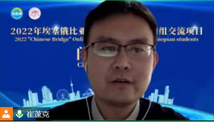 教师代表崔蓬克发言,回顾了为期9天的直播、录播课程以及丰富多彩的文化体验活动。这次线上团组交流项目有超过200名学员参加,其中包括多名埃塞俄比亚本土汉语教师。