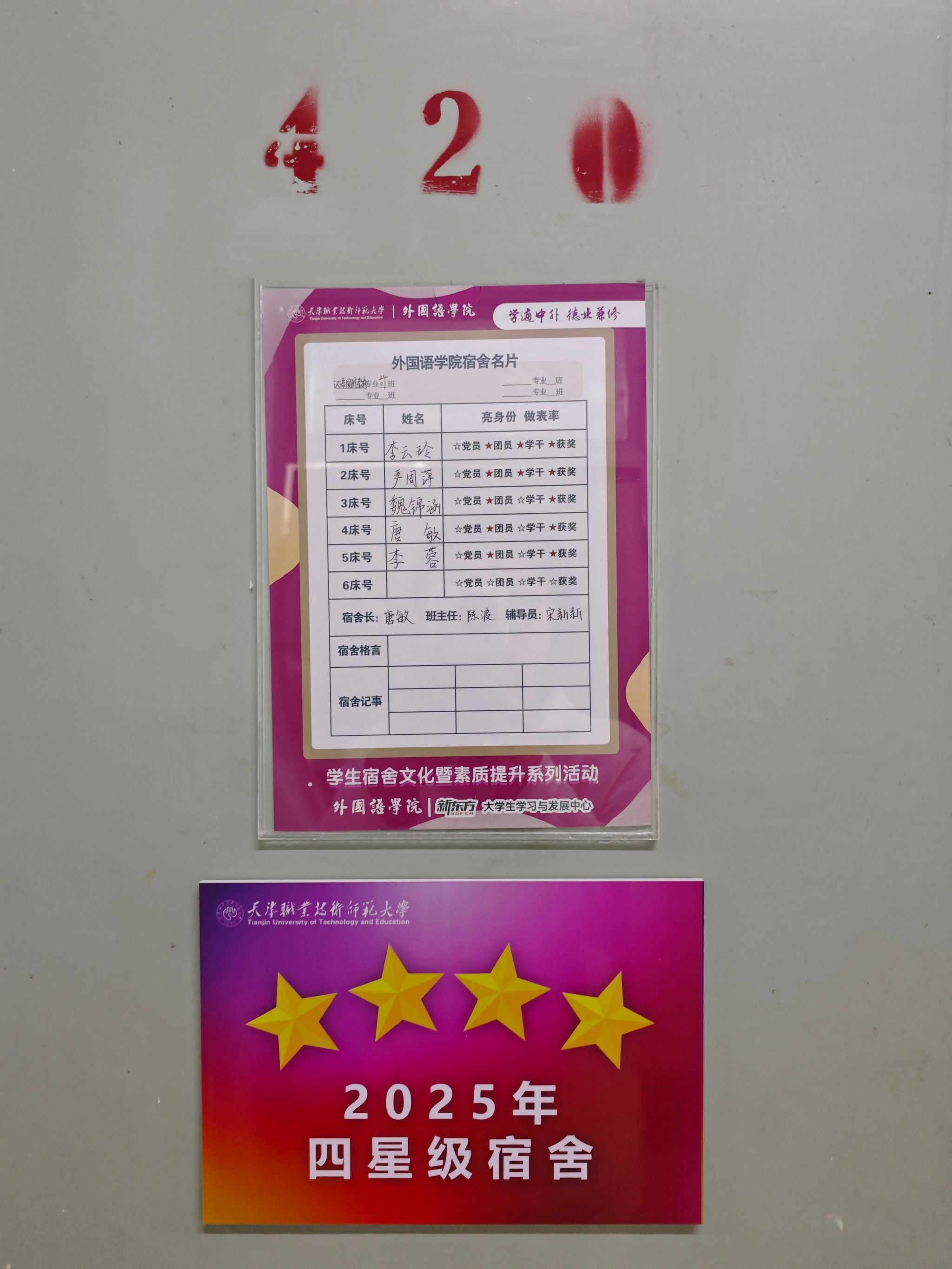此次推出的“宿舍名片”采用内容可更换式插盒设计,将宿舍内每名学生的姓名和相关经历进行展示,鼓励同学们共同制定宿舍公约、凝练宿舍精神,引导学生亮明党员、团员、学干等身份,发挥先锋模范作用,以点带面带动宿舍集体共同进步。“宿舍名片展示”建有常态化更新机制,在每学期初完成内容迭代,宿舍成员可结合新学期学习目标、个人成长规划及集体发展动态,自主调整展示信息,让小小的名片成为记录宿舍成长故事、传递青春正向能量的鲜活载体。同学们纷纷表示,将以此次活动为契机,共建温馨和谐、积极进取的“青春之家”。